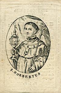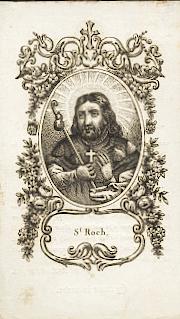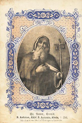 S-w-Lithographie auf hellbrauner Tonplatte blauer Bordüre. von Benziger / Einsiedeln um 1875, 127 x 85 mm, etwas fleckig und gebrauchsspurigt. # Hier Darstellung mit dem Stab und Glöckchen – jedoch ohne das Schwein # Selten und gesucht !