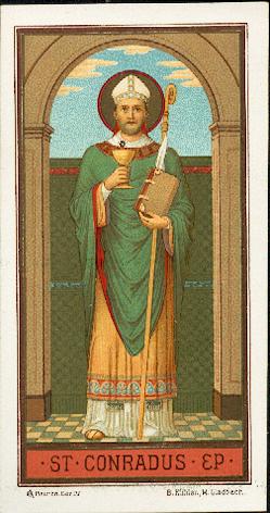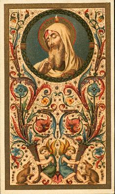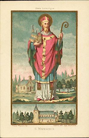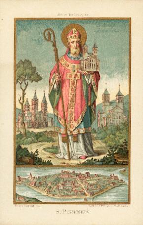 Mehrfarbige Lithographie bei Gangloff um 1900, 117 x 76 mm. Wunderschöne Darstellung des Heiligen in ganzer Figur. Rechts neben ihm die Abtei Reichenau, links neben ihm die Abtei von Murbach im Elsass. In der Bildkartusche unten die Insel Reichenau im Bodensee. Der Heilige Pirmin ist auch Namensgeber der Stadt Pirmasens.