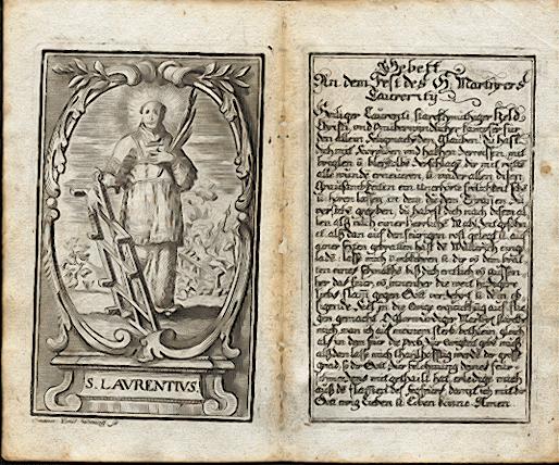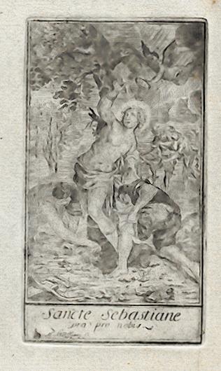 Kupferstich auf gefaltetem Gebetszettel als Einblattdruck von Joh. Balt. Wening (München 1672 – 1720). Um 1700, 150 x 180 mm. Der Text ebenfalls in Kupfer gestochen ! Leicht gebrauchsspurig , an der Bugfalte sauber und unauffällig an kleinen Stellen hinterlegt.