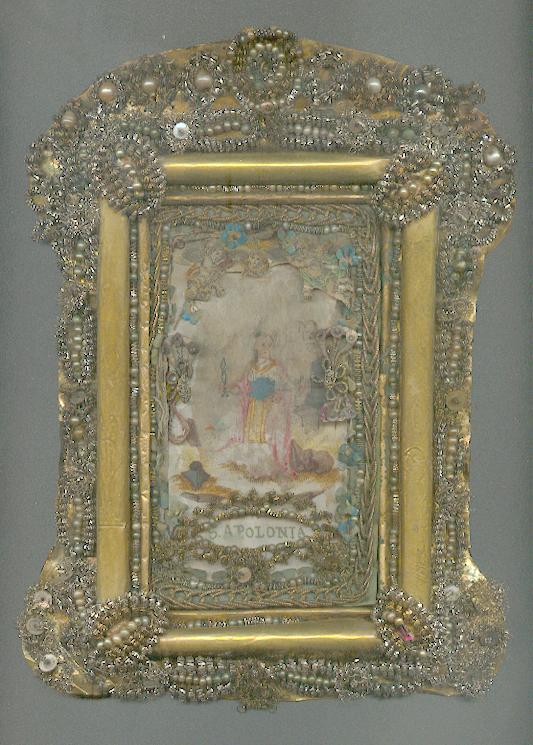 Mehrfarbige Gouache auf Pergament in ungewöhnlich aufwändiger Klosterarbeit mit Rahmen aus feinem gebogenen Messingblech auf Messingblech montiert – Rückseite verkleidet mit zeitgenössischem Buntpapier. Die verschiedenen Drahtarbeiten, Perlenstickereien und Kollagen aus kolorierten ausgeschnittenen Kupferstichen, Gewebeteilen, farbigem Glasschmuck und (Metall-)Pailletten in guter Erhalung. Lediglich die Gouache stärker wellig und angestaubt und etwas wasserfleckig (da nie unter Glas- sondern wohl wahrscheinlich immer offen im Gebetswinkel gehangen) 240 x 160 mm (die Gouache: 120 x 65 mm). Alpenländisch um 1740/60 Gesucht von Zahnärzten – Schutzpatronin der Zahnärzte und gegen Zahnleiden #