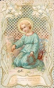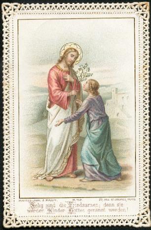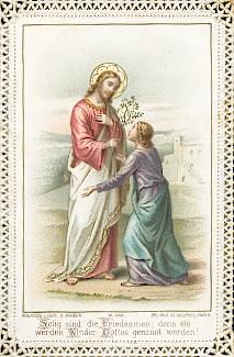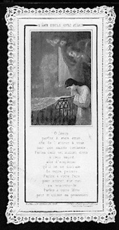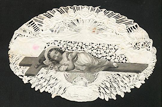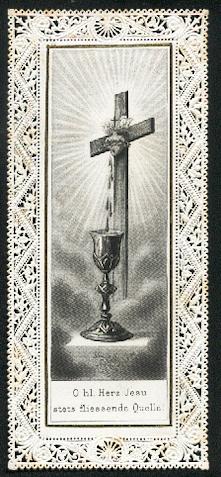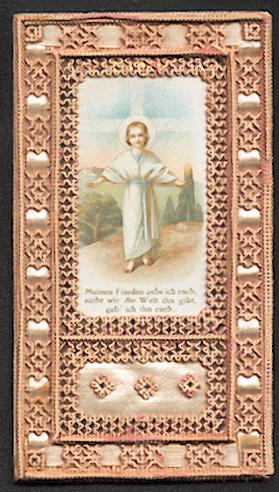 Mehrfarbige Lithographie auf Präge-Stanz-Spitze um 1900 von R. Kühlwein / Regensburg, 107 x 68 mm, etwas stockfleckig – sonst sehr schön erhaltenes, dekoratives Jugendstilbildchen.