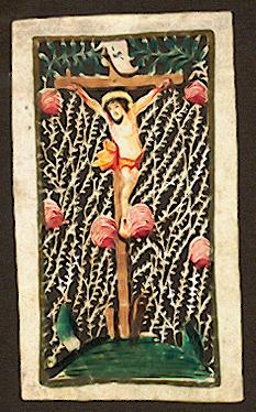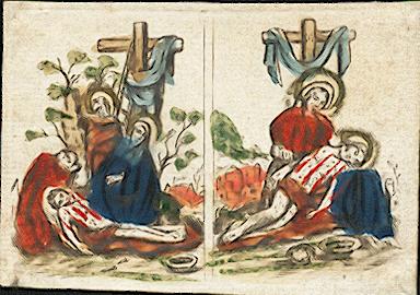 Mehrfarbige Gouache auf geschnittenem Pergament 18. Jh., 90 x 52 mm, leicht gebrauchsspurig. Der feine Schnitt intakt – hübsche Klosterarbeit.