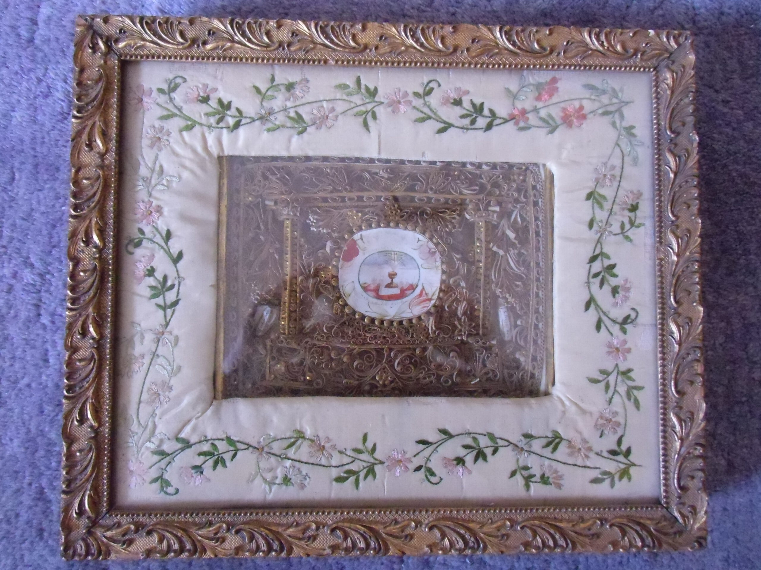 Französische Paperoles-Arbeit des 18. Jhds. mit Mehrfarbiger Gouache auf Pergament und 4 Reliquien (ex ossibus) in einem Holz-Rahmen unter Glas um 1900 mit bestickter Seiden-Bordüre – aufgearbeitet wohl um 1980. 310 x 360 mm. Leicht gebrauchsspurig – jedoch sehr dekorativ ! Reliquien: 1) “S. Benedicti mart.” 2) “ S. Candidi mart.” 3) “ S. Lucundi mart.” 4) “ S. Prosperi mart.”