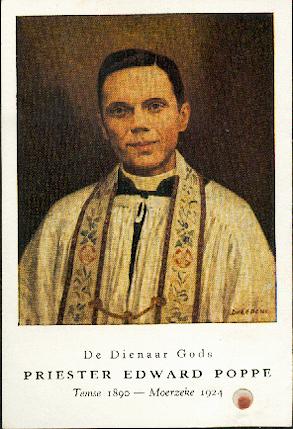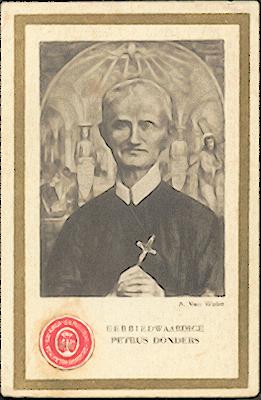 Mehrfarbiger Druck mit Sekundär-Reliquie (Textil – “Stof door hem gedragen”) 1930, 120 x 80 mm, stärker gebrauchs- und knickspurig. Niederländisch. Rückseite Vita.