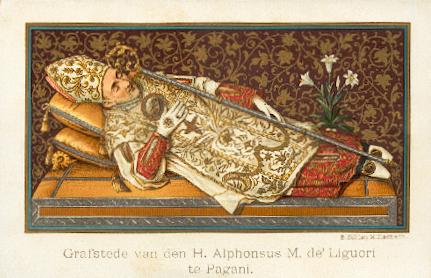 Mehrfarbige Lithographie bei Kühlen / Mönchengladbach um 1900 mit Sekundär-Reliquie auf der Rückseite unter Papiersiegel (“Ex Arca Sepulcrali S. Alphonsi”).Text und Gebet in niederländisch. 82 x 127 mm, schönes Exemplar. Gesucht und selten !