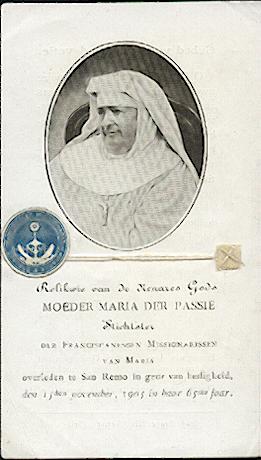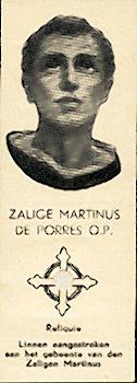 Druck mit Sekundär-Reliquie. 4 Seiten um 1948, 115 x 71 mm, Seiten mit Kurzbiographie und Gebeten in niederländisch. Reliquie mit Papiersiegel bedeckt.Schöne Erhaltung.