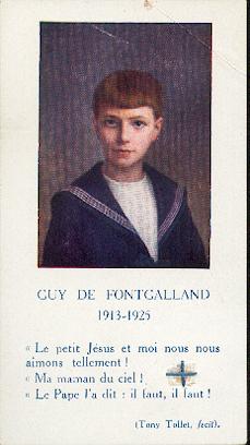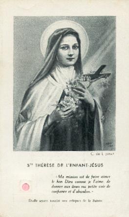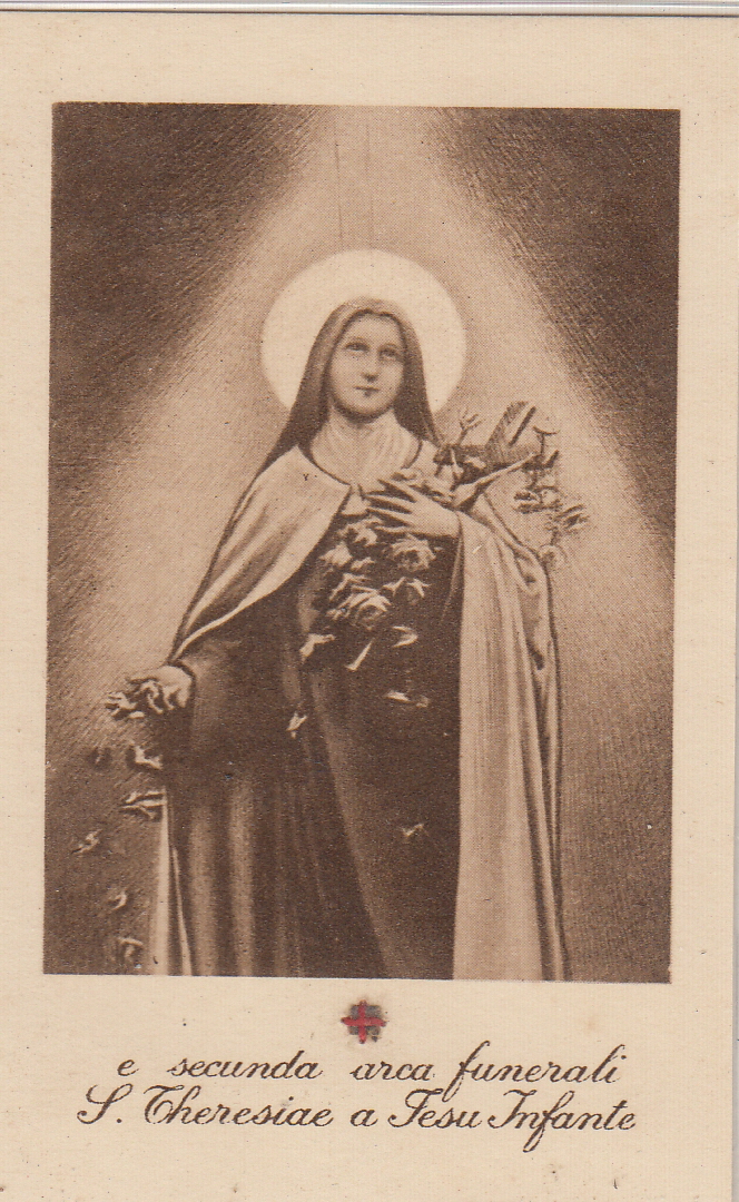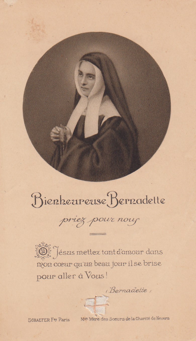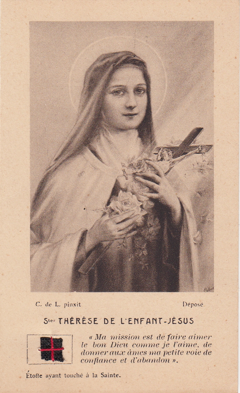 Kupfertiefdruck um 1947 mit Sekundär-Reliquie, 110 x 65 mm, 4 Seiten, ordentlicher Zustand Kurzbiograpie und Gebete in französisch Mit hübschem geprägtem Papiersiegel.