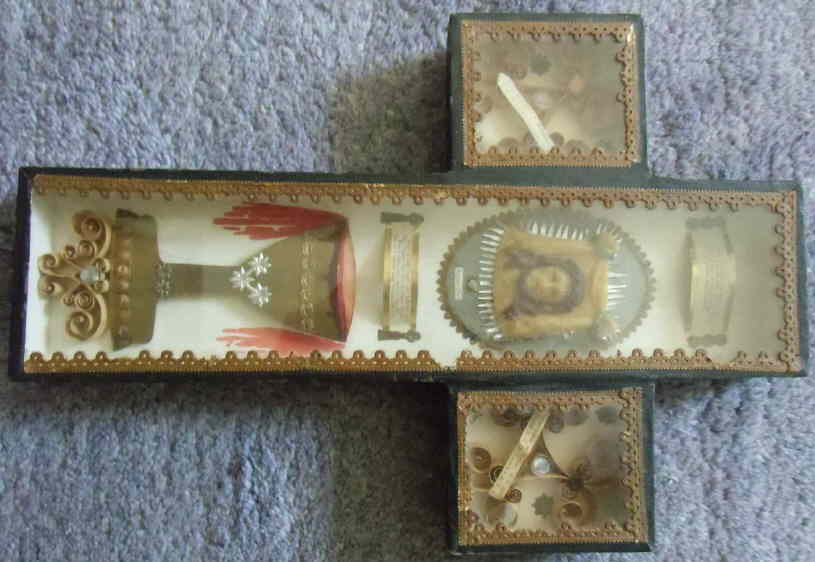 Reliquiar in Kreuzform als Klosterarbeit mit Paperoles, Wachs und Papierarbeiten unter Glas um 1925, 360 x 240 mm. Die Reliquien: 1. Hl. Therese vom Kinde Jesu (Textil) – Sekundär-Reliquie 2. Hl. Blut von Boxmeer (Textil) – Tertiär-Reliquie 3. Agnus Dei – Stückchen der päpstlichen Osterkerze