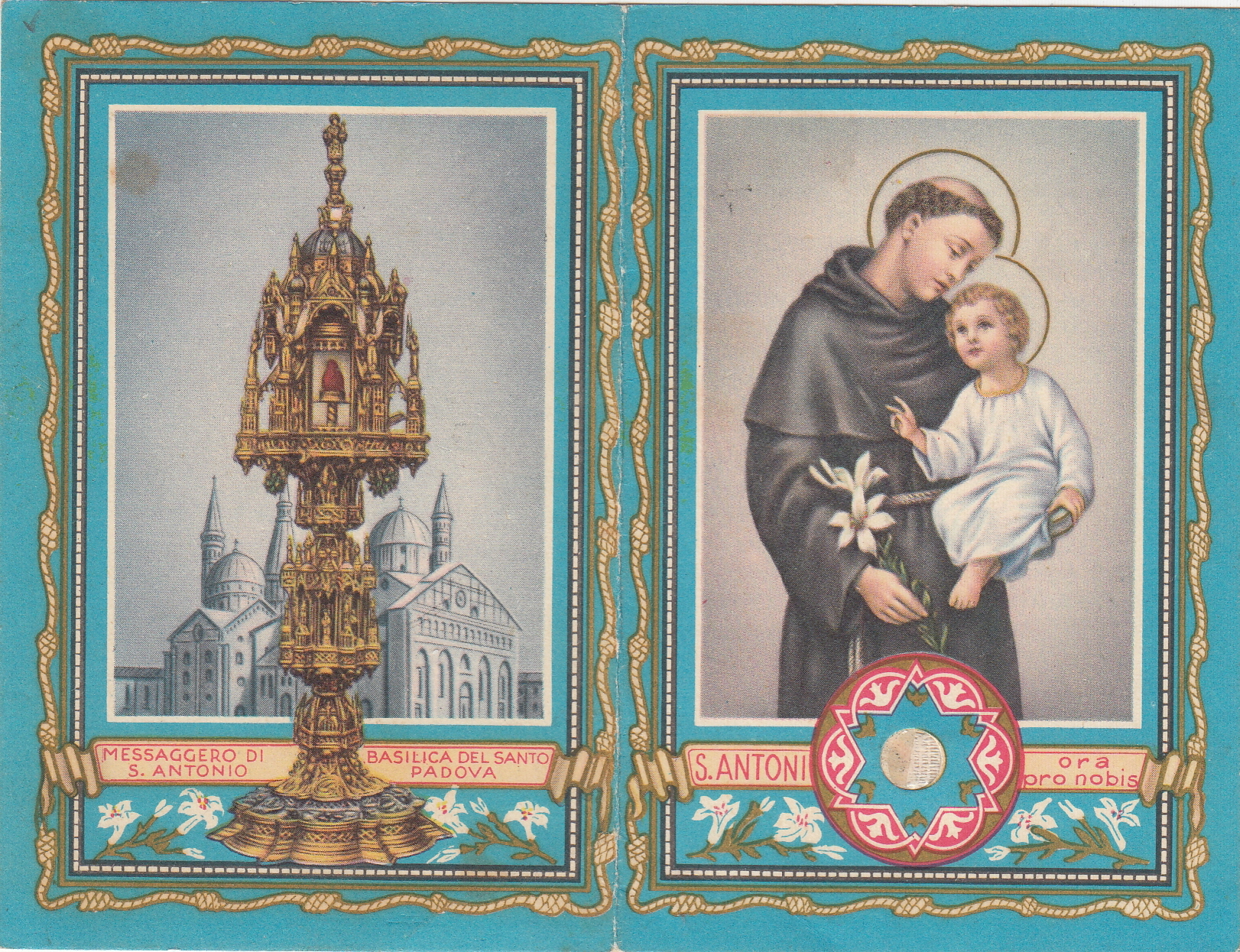 Brauner Druck mit Sekundär-Reliquie (“ex indumentis”) um 1956, 4 Seiten, 124 x 77 mm, etwas gebrauchsspurig. Innen kleines Papiersiegel, Texte in italienisch.
