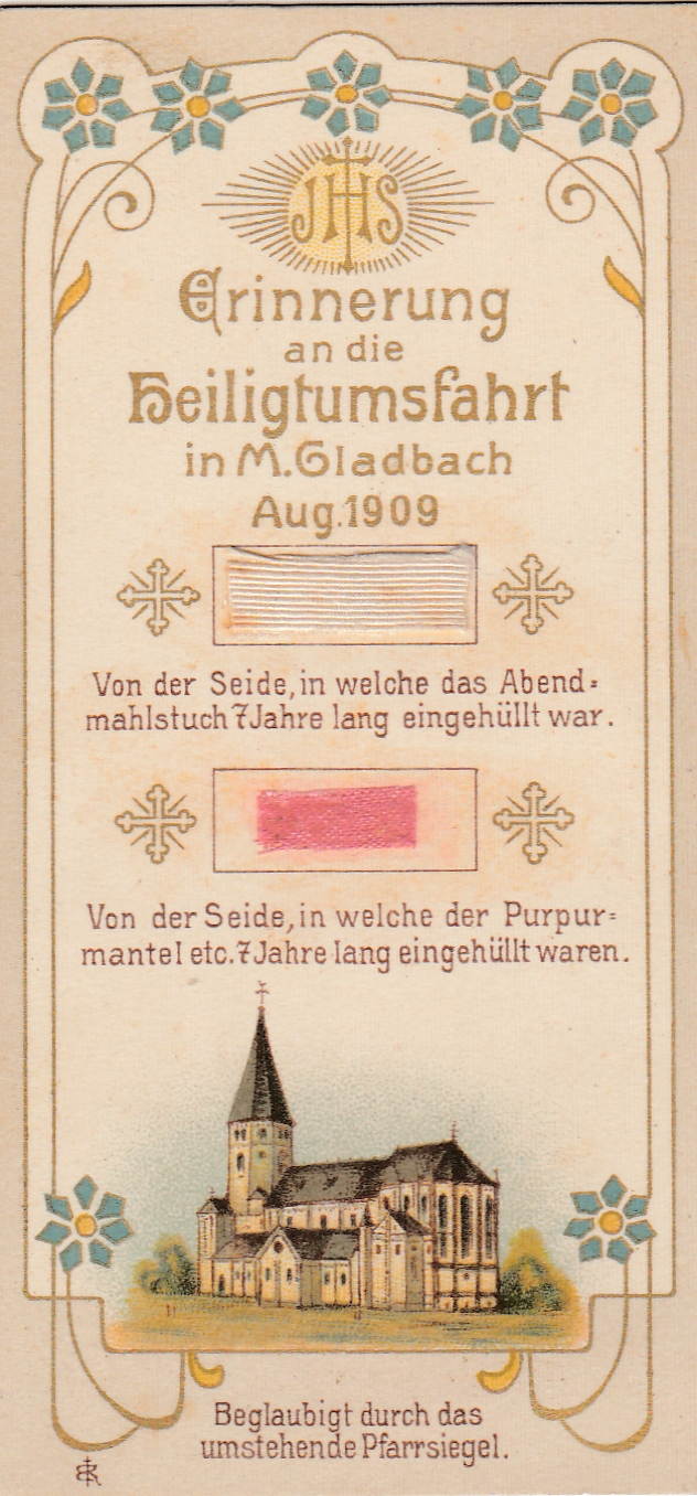 Kupfertiefdruck mit Sekundär-Reliquie (Textil) um 1928, 4 Seiten, 116 x 75 mm, Text in französisch. Schöns Expl.