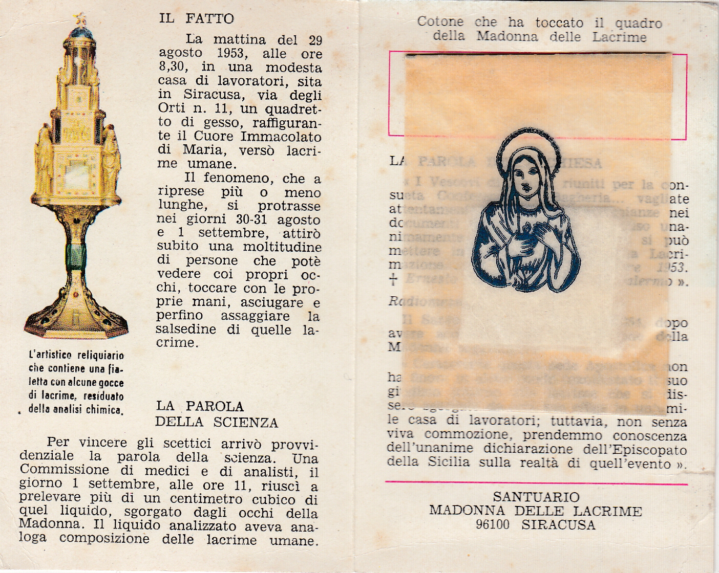 Mehrfarbiger Druck mit Watte /Gewebe, die an dem Leinen mit den Tränen der Maria von Syrakus berührt wurde, um 1969, 95 x 60 mm, gebrauchsspurig, Text in italienischer Sprache.