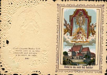 Mehrfarbige Lithographie in mehrfarbig lithographierter Klappkarte mit Präge-Stanz-Spitze um 1910 tschechisch bei Derka / Olmütz, 104 x 73 mm. Ordentlicher Zustand.