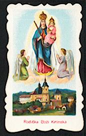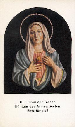Mehrfarbiger Druck, der ein Tüchlein mit den Tränen der Madonna berührt hat ( Berührungs-Reliquie – geweiht ) um 1953, 112 x 67 mm, mit deutschem Text, etwas gebrauchsspurig