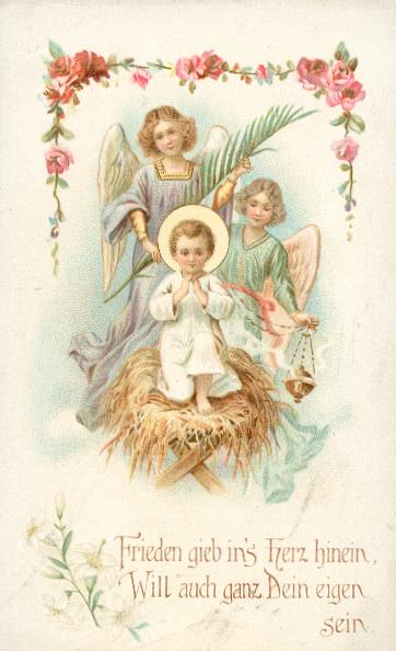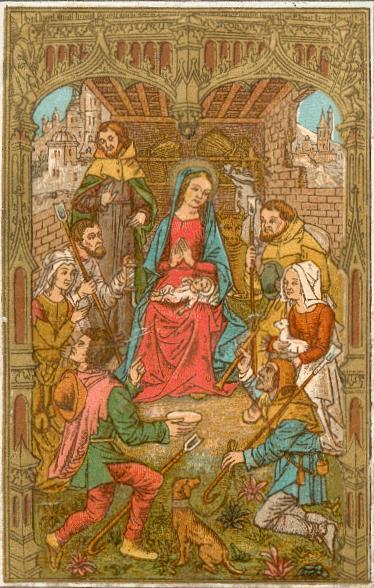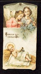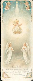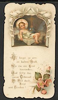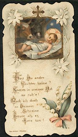 Mehrfarbige Lithographie mit Stanz-Rand von Max Hirmer / München um 1900, 110 x 60 mm, leicht gebrauchsspurig. Weihnachtsdarstellung mit Maiglöckchen !