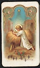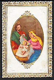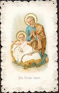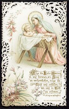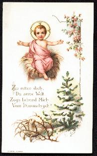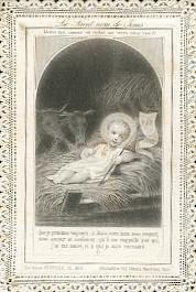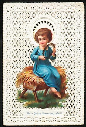 Mehrfarbige Lithographie montiert auf weiß-goldener Präge-Stanz-Spitze um 1880, 103 x 67 mm, von ordentlicher Erhaltung. Rückseite dt. Gebet.
