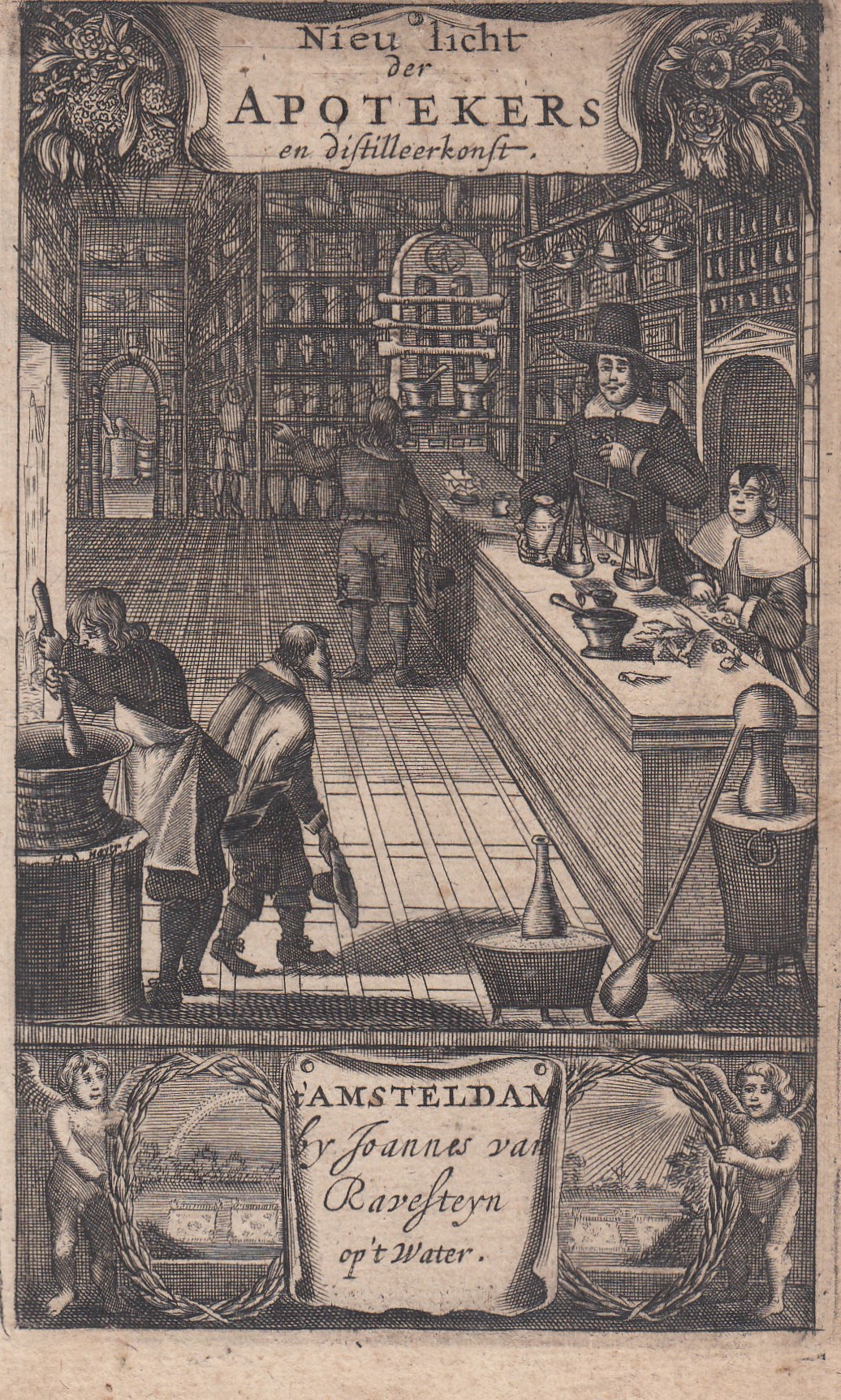 # Sehr hübsche Innen-Darstellung einer Apotheke mit Apotheker bei der Arbeit inkl. mehreren Gehilfen. Selten! #