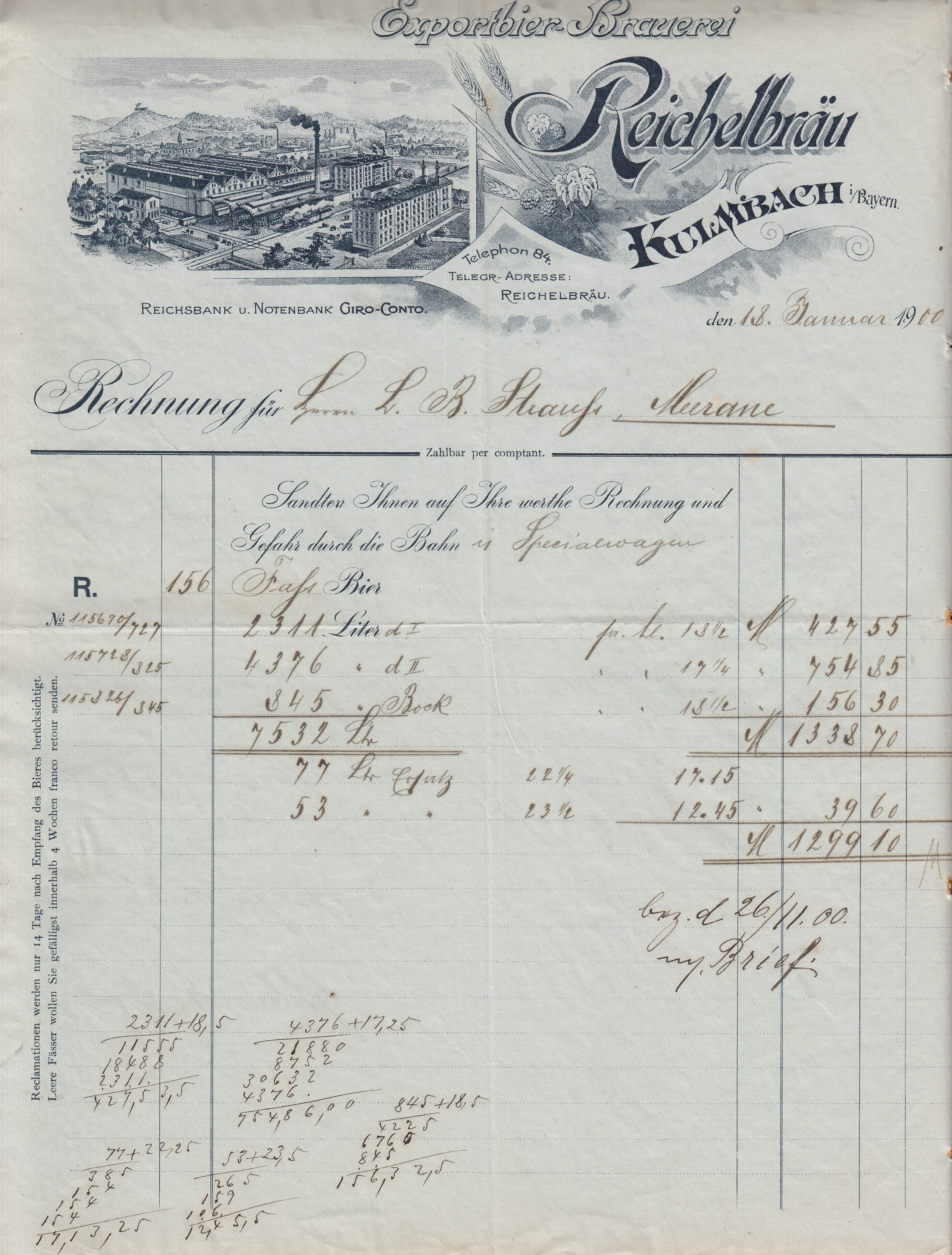 Blaue Lithographie mit Firmenansicht hds. dat. 1900, 290 x 223 mm, 4 Seiten, gutes Expl. mit Faltspuren.